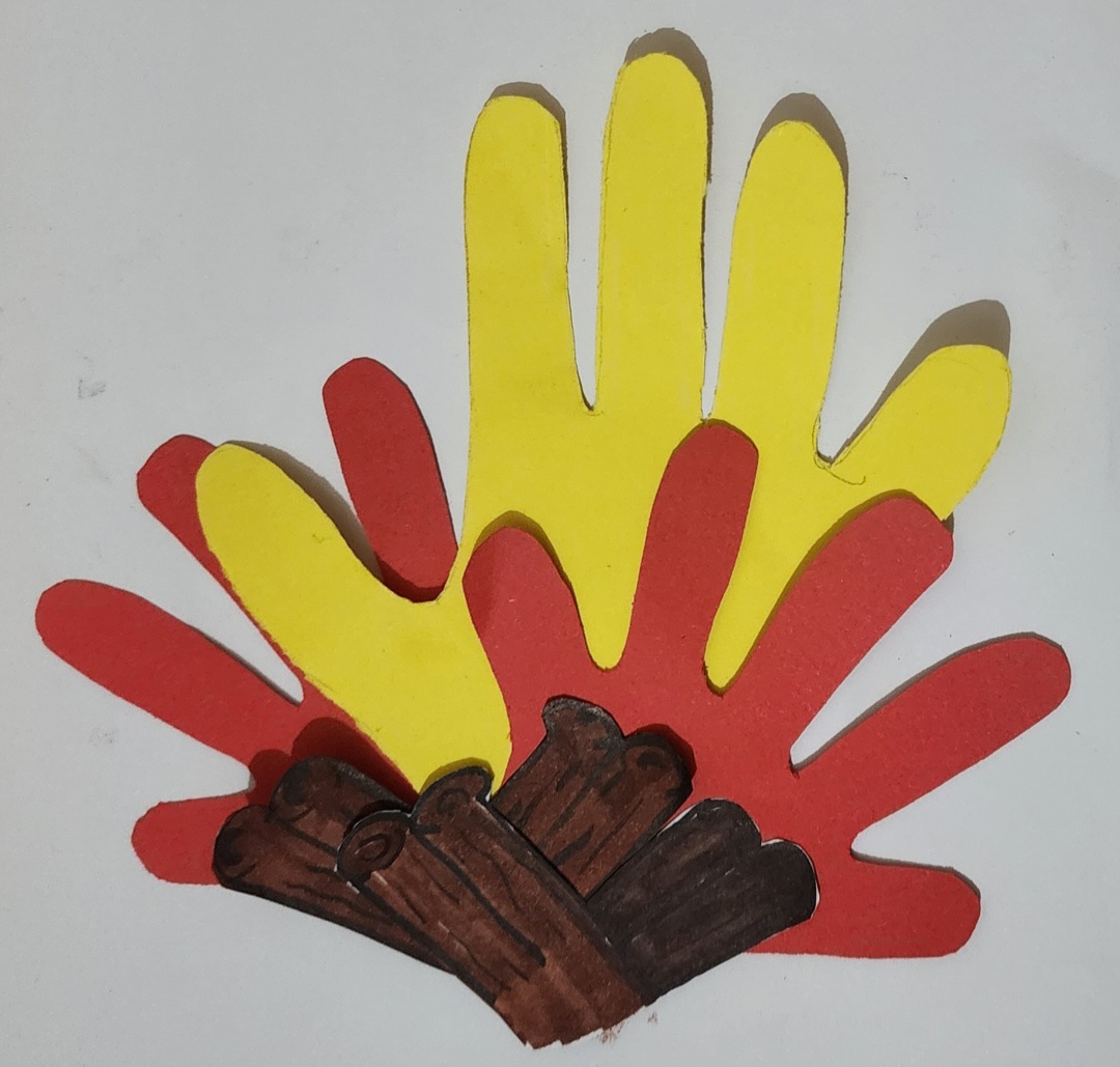 Layer the red, orange, and yellow handprints above the logs to create a glowing fire effect. Glue them in place, with red on the outside, orange in the middle, and yellow on top.