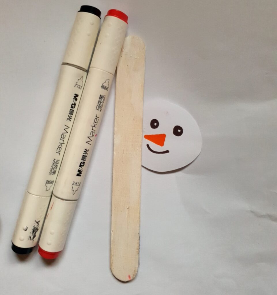 Use black paper or paint to color the top 1/4 of the sticks—this will be your snowman’s hat. You can add a little band or bow for decoration.