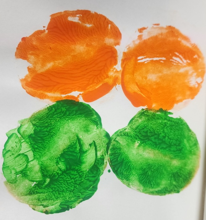 Step 3: Press the stamp onto paper to create one wing. Dip again and press beside it to form the second wing, creating a butterfly shape. Clean the potato surface and dip in another color to form other wings.