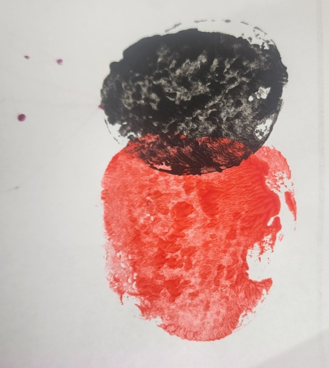 Step 2: Dip the flat side of the potato into red paint. Gently press it onto paper to create the ladybug body. Clean the potato and dip it in black paint to create ladybug head.