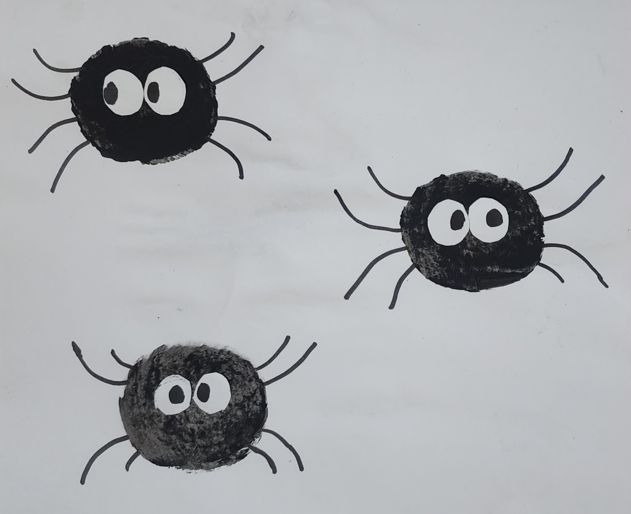 Once the paint is dry, use a black marker, crayon, or even strips of black paper to add eight legs to each spider.